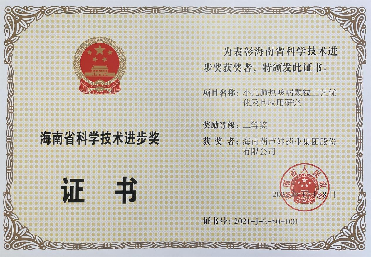 为此,小儿肺热咳喘颗粒的制备方法获得了第二十一届中国专利优秀奖(2019年),专利申请号:ZL201010134951,此次作为专利技术的应用,获得了2021年度海南省科学技术进步奖二等奖。在此之前,BG视讯牌小儿肺热咳喘颗粒还多次被授予“临床价值中成药品牌”、“中国连锁药店最具合作价值单品”,荣登“中国医药品牌榜”。